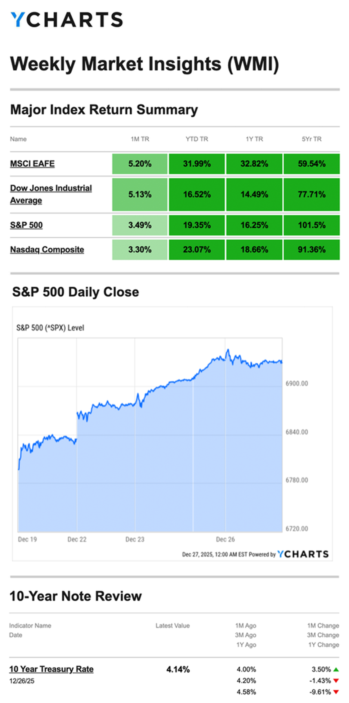Source: YCharts.com, December 27, 2025. Weekly performance is measured from Friday, December 19, to Friday, December 26. TR = total return for the index, which includes any dividends as well as any other cash distributions during the period. Treasury note yield is expressed in basis points.