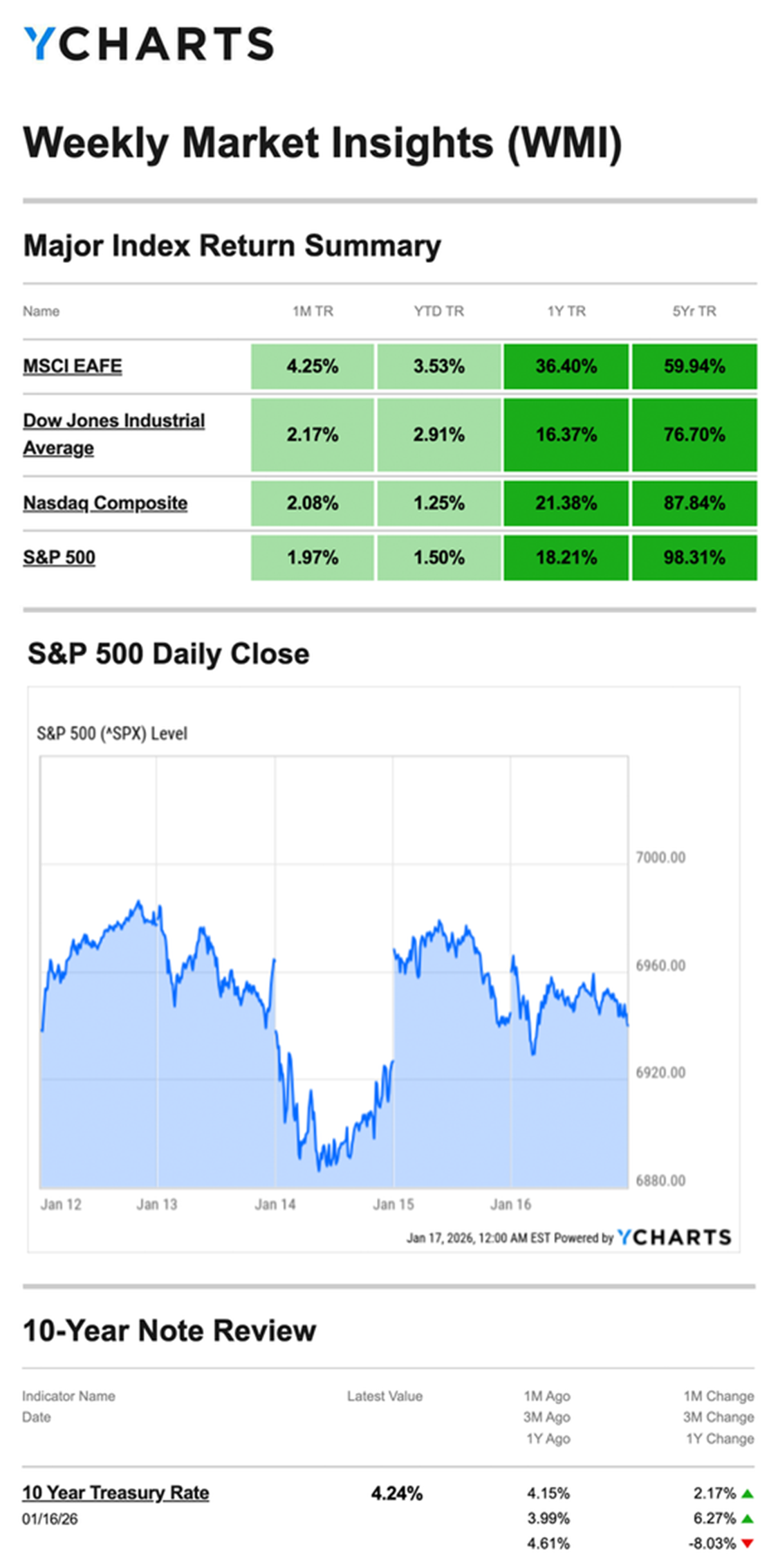 Source: YCharts.com, January 17, 2026. Weekly performance is measured from Monday, January 12, to Friday, January 16. TR = total return for the index, which includes any dividends as well as any other cash distributions during the period. Treasury note yield is expressed in basis points.
