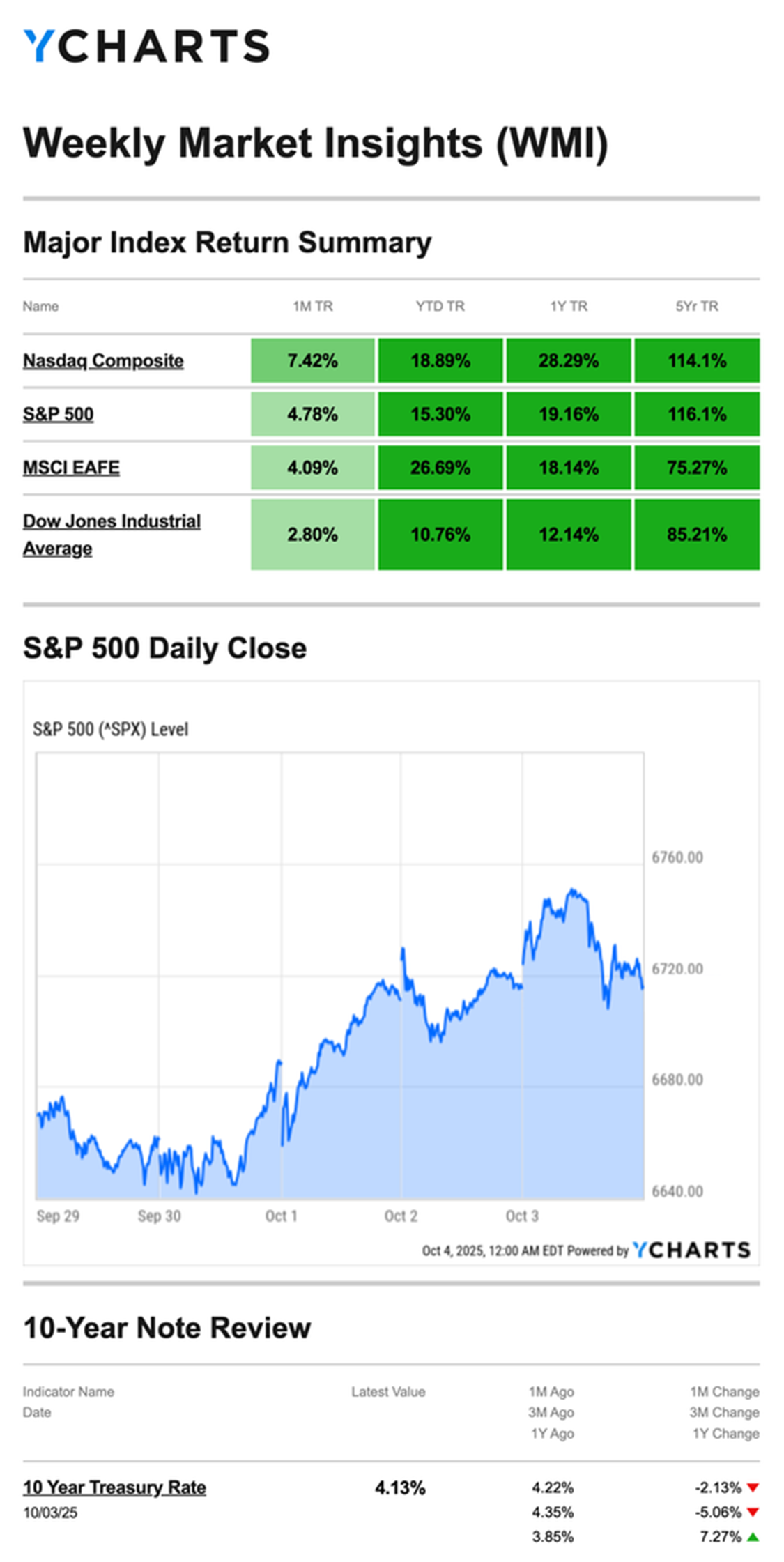 Source: YCharts.com, October 4, 2025. Weekly performance is measured from Monday, September 29 to Friday, October 3. TR = total return for the index, which includes any dividends as well as any other cash distributions during the period. Treasury note yield is expressed in basis points.